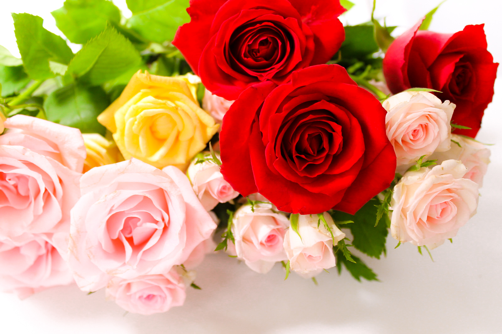 バラ、カスミソウ、ピンク色のチューリップ、紫色のラナンキュラス、